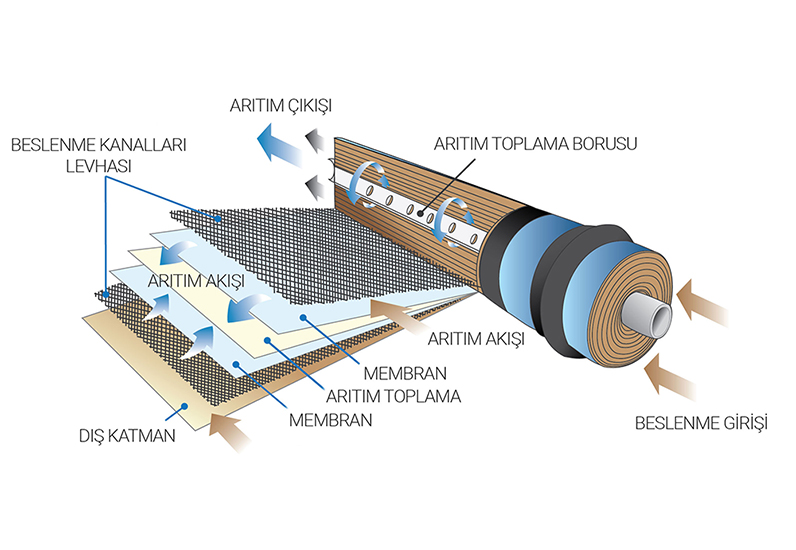 Ozmotik basınç ile kendiliğinden gelişen bu olaya ozmotik basınçtan daha yüksek bir basınç uygulandığında (pompa, şebeke hattı) bu işlem ters osmos olarak adlandırılır. Membran sadece saf su moleküllerini geçirerek suyun içerisindeki organik ve inorganik maddeleri, tuzları, ağır metalleri, virüsleri ve bakterileri sudan arındırır.