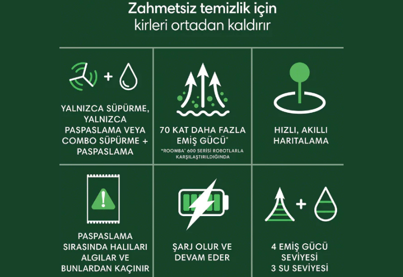 Her türlü kirliliğin üstesinden gelin ve döküntüleri bize bırakın. Roomba® 105 Combo Robot, 70 kat daha fazla emiş gücü¹, 2 kat daha derin temizlik² ve geliştirilmiş navigasyon¹ özellikleriyle her türlü ıslak ve kuru iş için tasarlanmıştır.