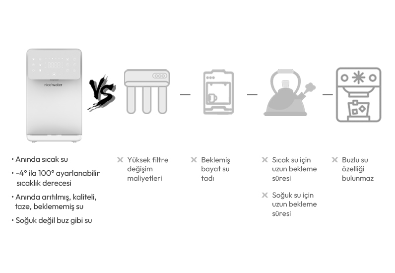 NiceWater NW51, sıcak, soğuk ve arıtılmış suyu aynı cihazda sunan yeni nesil bir tezgah üstü su arıtma sistemidir. Su bağlantısı gerektirmeden çalışır, 4,8 litrelik haznesiyle yalnızca 5 dakika içinde içime hazır sıcak ve soğuk su sağlar. Havacılık teknolojisinden ilham alan gelişmiş ters ozmoz arıtma sistemi, UVC sterilizasyon ve yarı iletken soğutma teknolojisiyle hem hijyenik hem de pratik bir kullanım sunar.