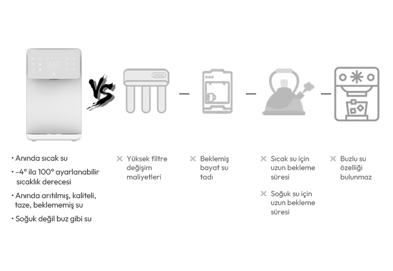 Ana Filtre (Membran + Post Karbon): Mikrobiyolojik ve bakteriyel arıtma yapar, kokuları giderir. (Ömrü: 12–24 ay) - Kapasite: 4,8 L su haznesine suyu koyun, fişe takın ve çalıştırın. Yaklaşık 5 dakika içinde sıcak ve soğuk su hazır olur.